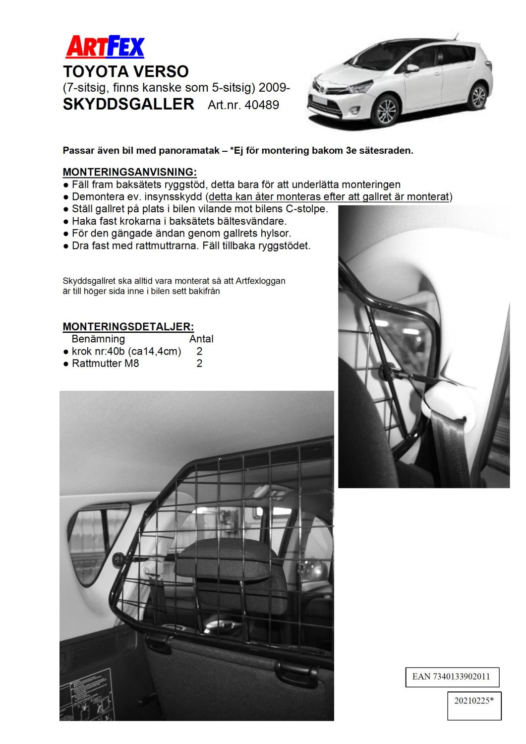 Modellanpassat Artfex Lastgaller, även kallat Skyddsgaller, till Toyota Verso 2009-