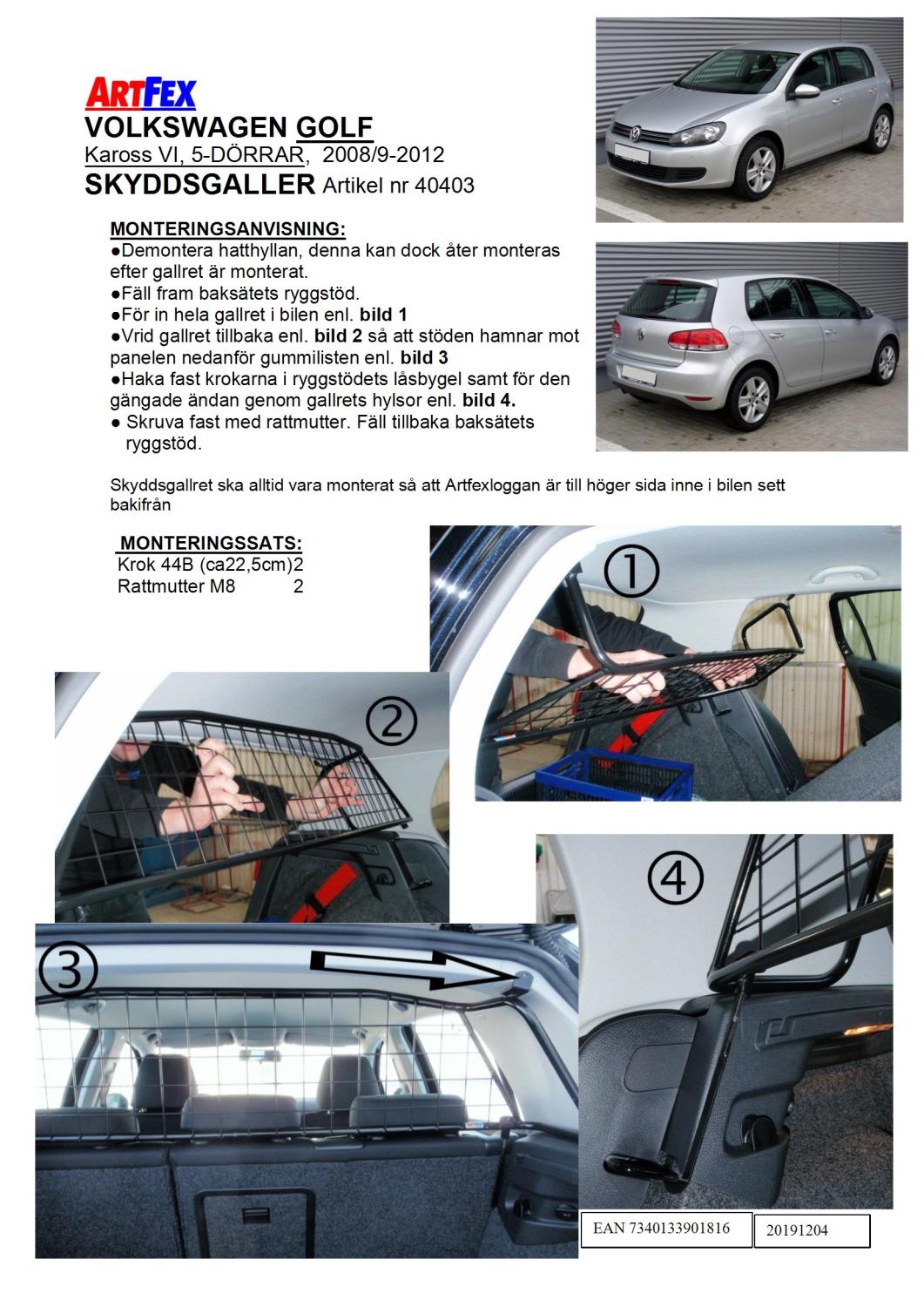 Modellanpassat Artfex Lastgaller, även kallat Skyddsgaller, till Volkswagen Golf VI 5-d 2009-
