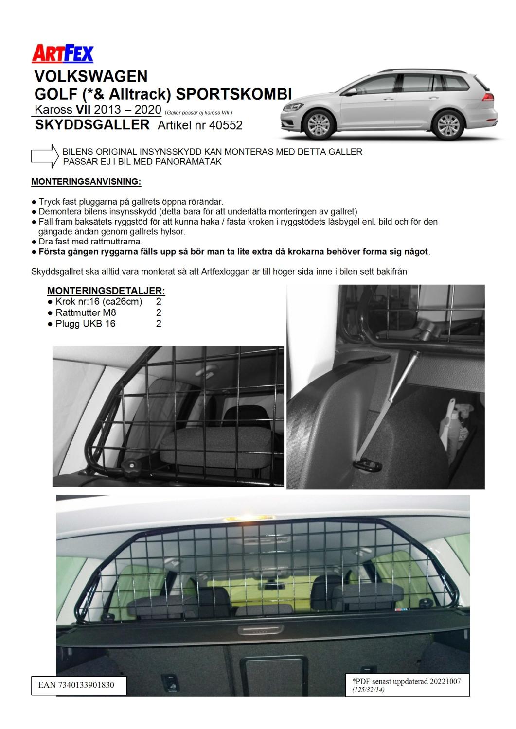 Modellanpassat Artfex Lastgaller, även kallat Skyddsgaller, till Volkswagen Golf Sport Kombi VII 2013–2019