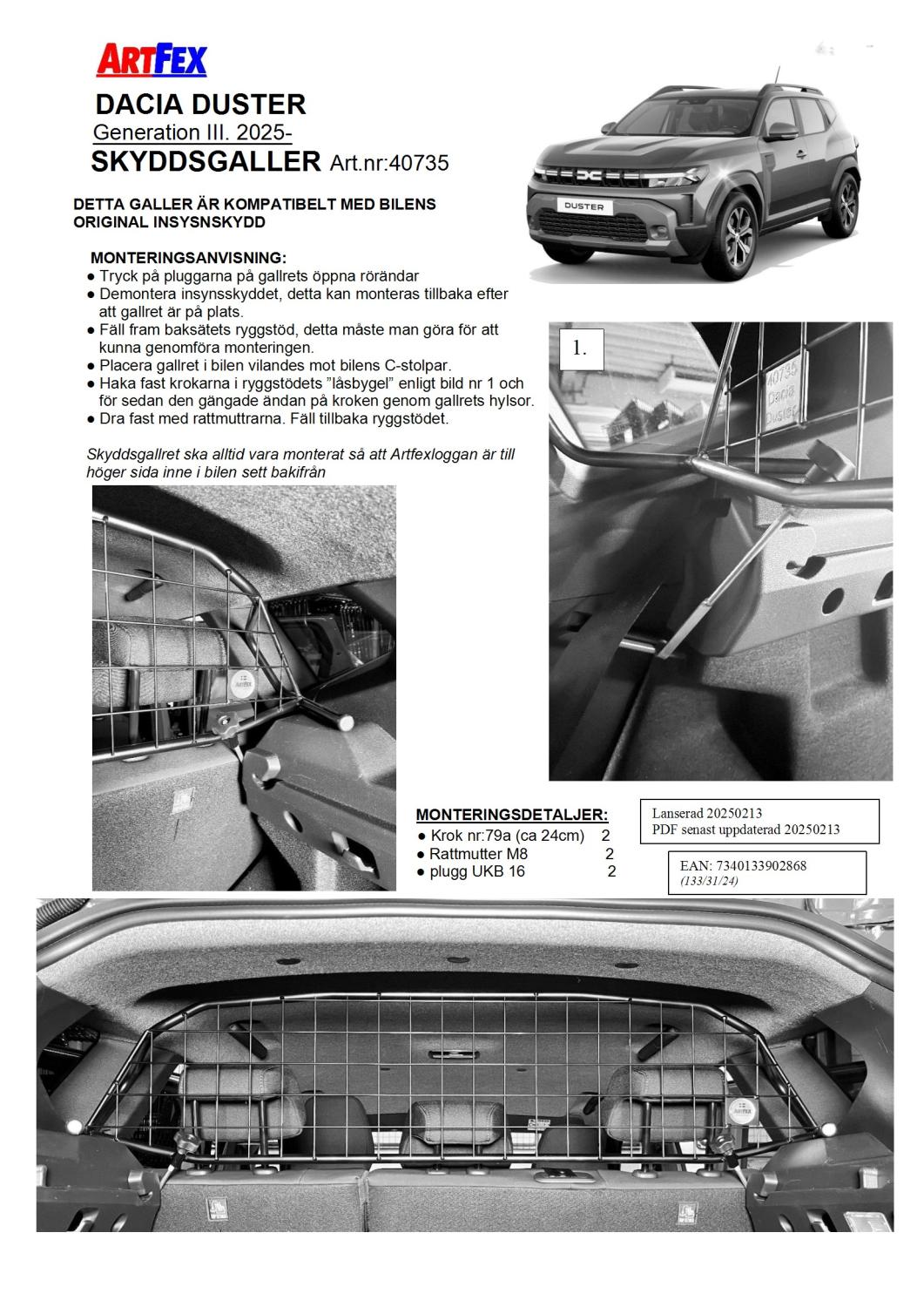 Modellanpassat Artfex Lastgaller, även kallat Skyddsgaller, till Dacia Duster 2024-
