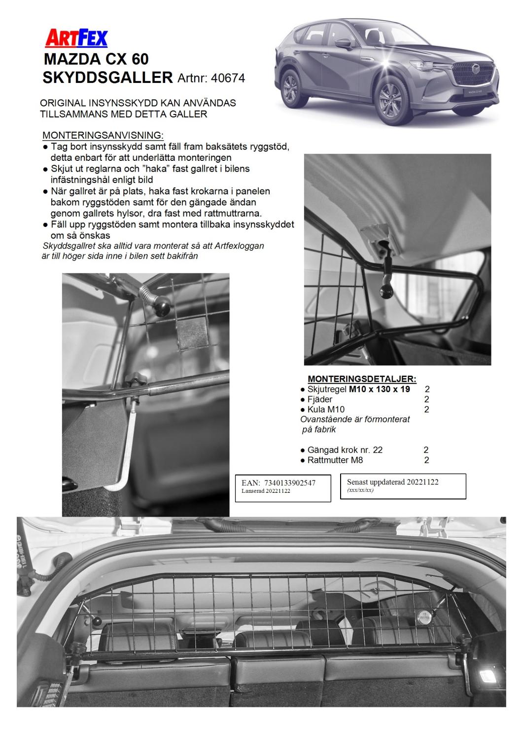 Modellanpassat Artfex Lastgaller, även kallat Skyddsgaller, till Mazda CX-60 2022-