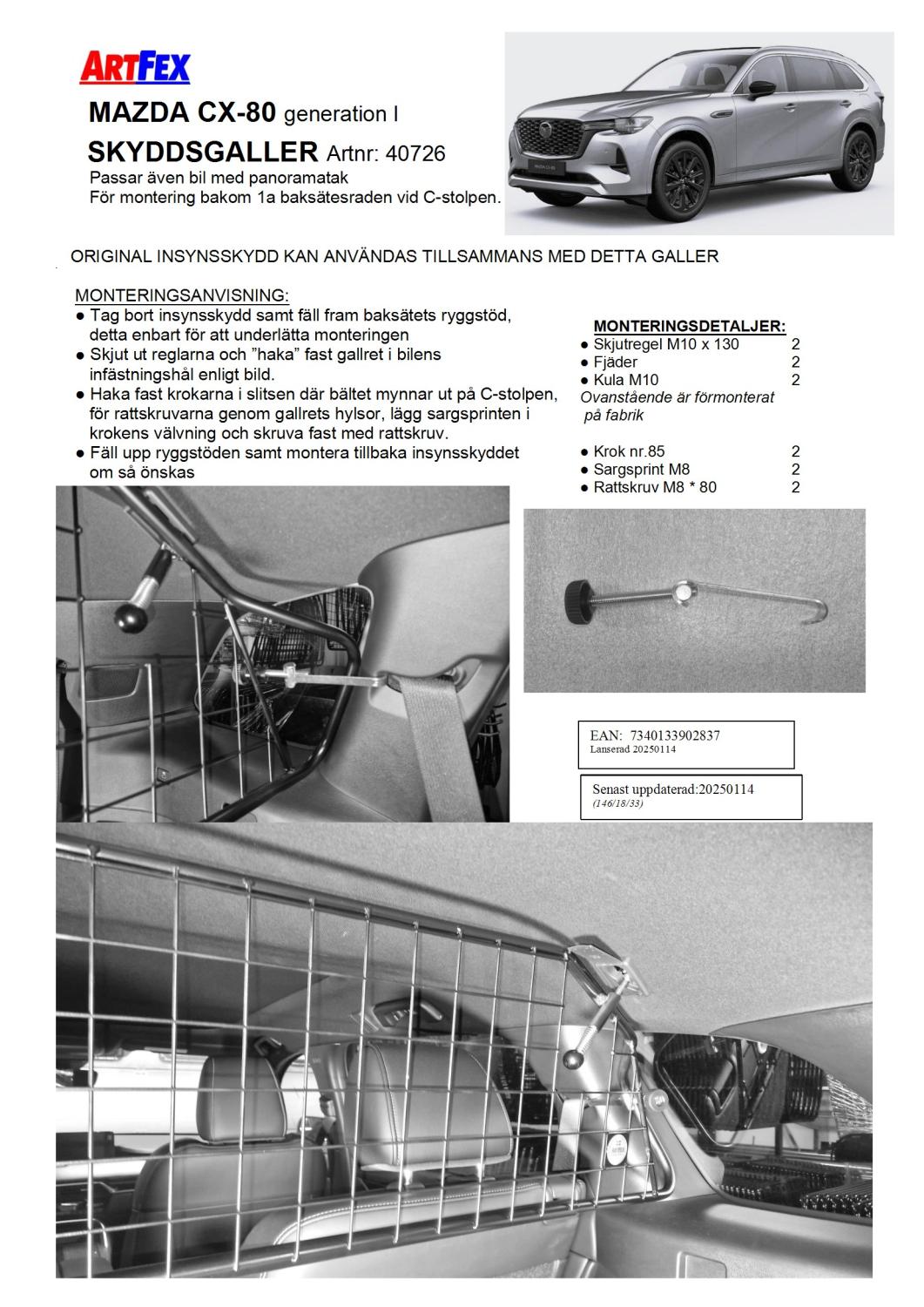 Modellanpassat Artfex Lastgaller, även kallat Skyddsgaller, till Mazda CX-80 2024- gen 1