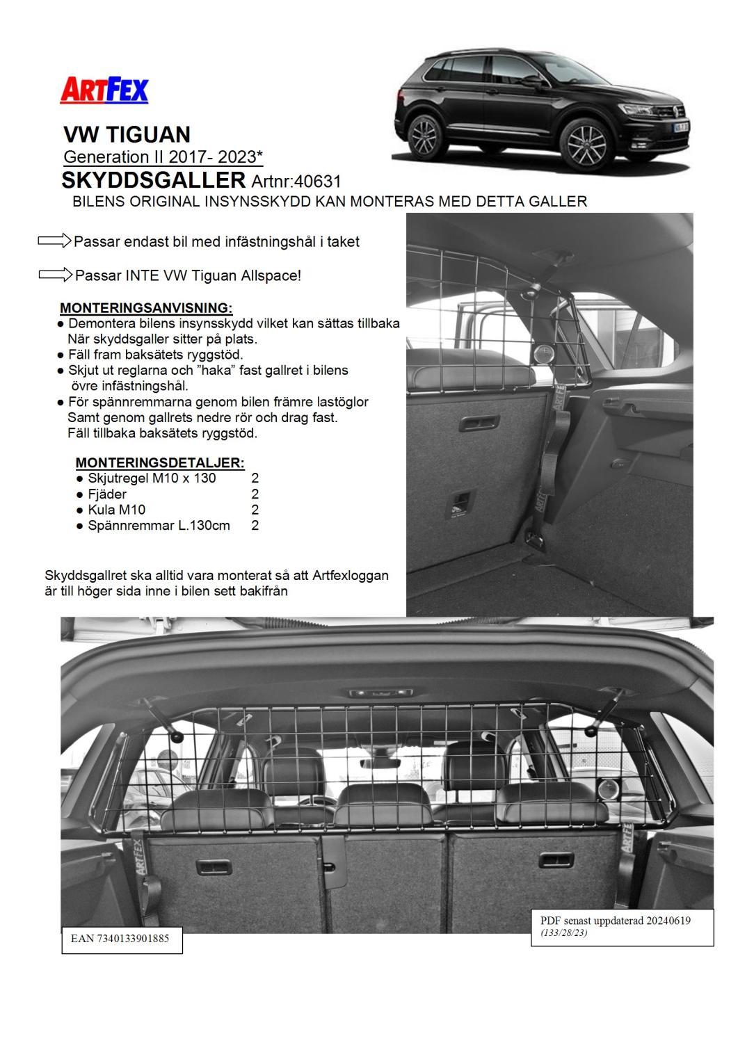 Modeltilpasset Artfex Lastgitter VW Tiguan 2016- Generation 2